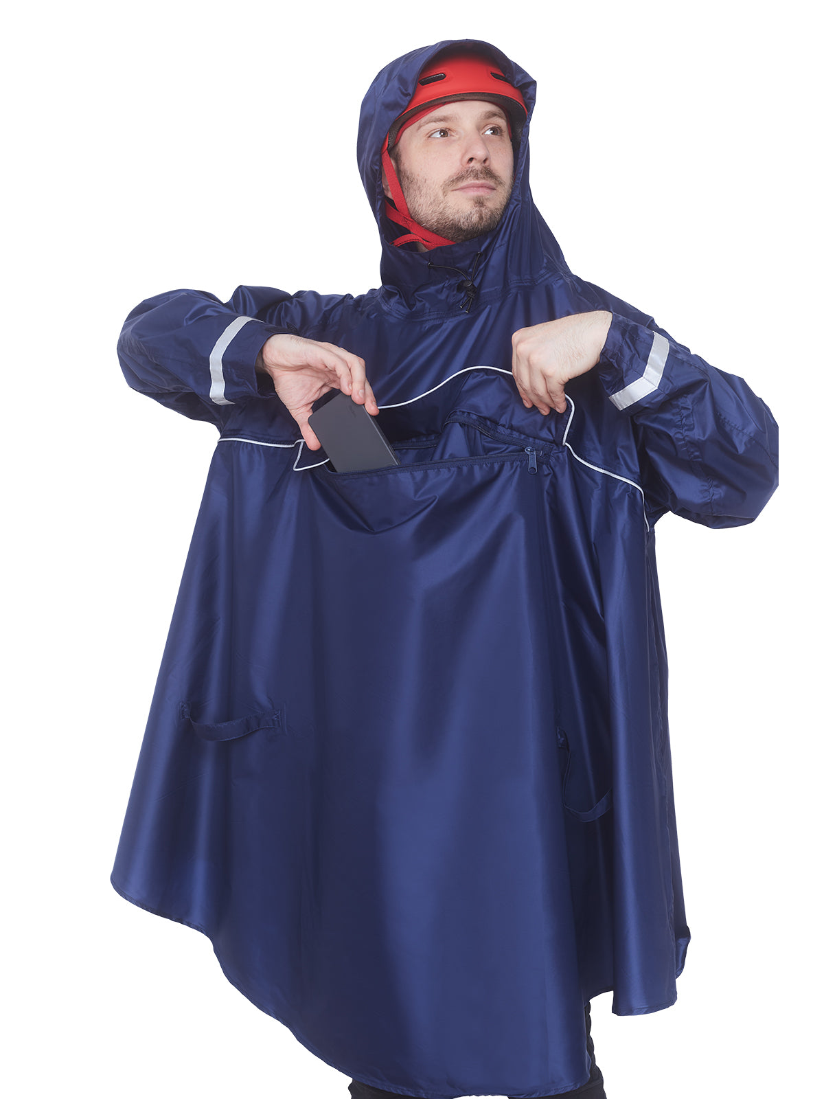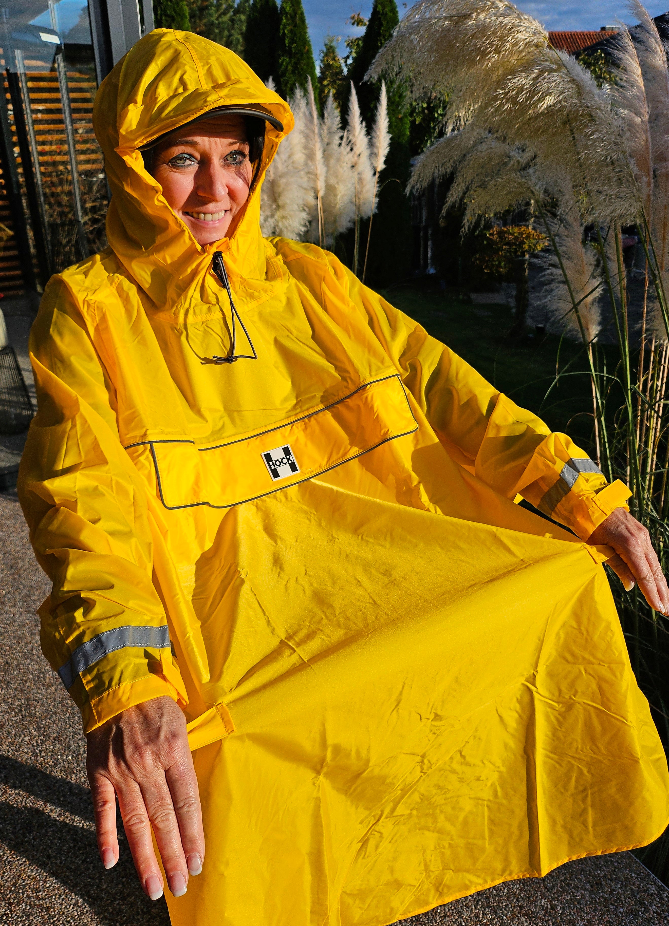 Hinweis: Wie bei allen Ponchos können Unterschenkel bei starkem Seitenwind nass werden. Für längere Starkregen‑Fahrten: Überschuhe empfohlen.